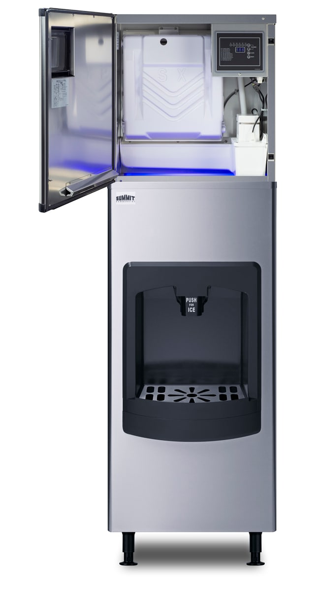 ENERGY STAR certified commercial ice machine with dispenser function that is ETL-S listed to NSF-12 standards. This ice machine features a fully finished stainless steel cabinet and a jet black front with an easy-to-use slide-up lid. It can be used freestanding with an air-cooled system to prevent overheating. Inside, the BIM350KDISP produces up to 350 lbs. of clear, cube-style ice cubes daily. The interior can store up to 130 lbs. to help meet the needs of high-traffic commercial environments. It features an ice dispenser which allows for easier access to ice and reduces the risk of contamination by restricting access to the ice storage bin. All digital controls are conveniently located in front, including a function to adjust the thickness of each ice cube. This unit has a water filter and a removable mesh filter at the rear to ensure easier condenser maintenance. This automatic ice machine features a clean function, a full bin sensor, attractive LED lighting, and an ice scoop.