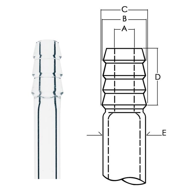 Chemglass Life Sciences 4 Ring Hose Connection, "A" = 2.5, "B" = 6.5, "C" = 8, "D" = 20; "E" = 8