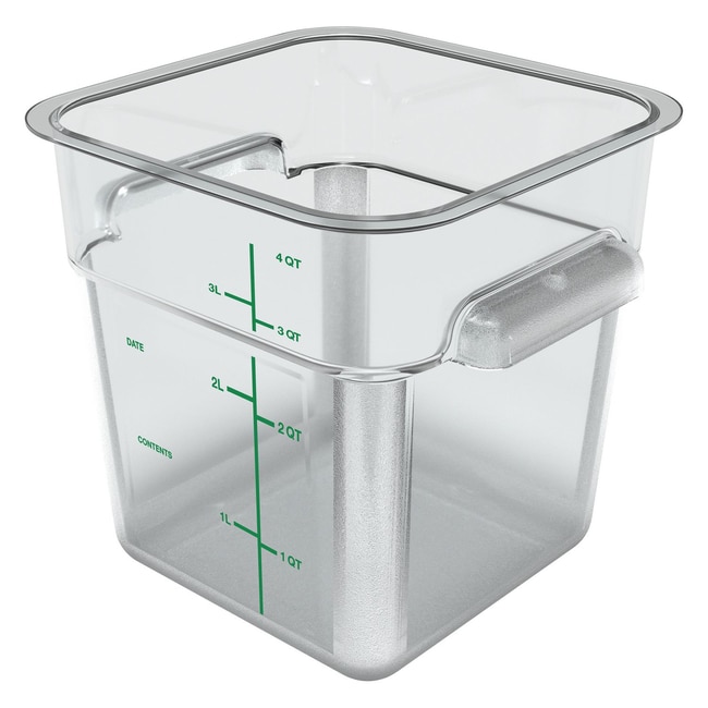 Maximize storage space for a variety of items in Carlisle Squares food storage containers Tight fitting color-coded lids (sold separately) encourage organization and reduce cross-contamination Color-coded liter and quart markings match color-coded lids to ensure a quick and easy match Keep food organized and separated for sanitary storage Food Container Type- Base Material(s)- Polycarbonate Material Type- Plastic Interior Volume Capacity- 4 qt