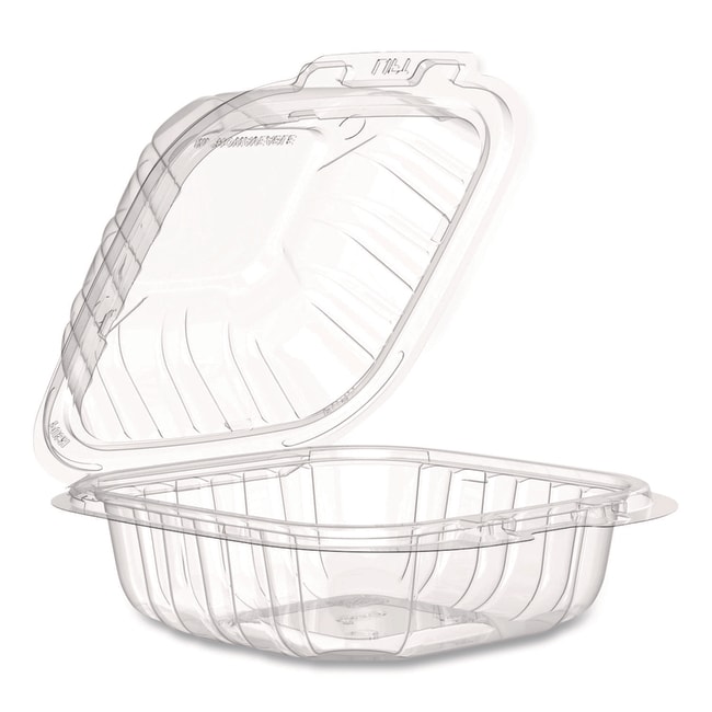 Keeps your food protected while offering a clear view of its contents It is crush-resistant and designed for easy stacking Its dual-temperature use cuts inventory for serving both hot and cold foods The reassuring snap of the lid designed for easy closure ensures that food items are securely stored Its durability and versatility make it an excellent choice for diverse foodservice needs ProPlanet Seal This product earns the ProPlanet Seal because it is compatible with common reclamation processes and can be sorted in materials recovery facilities (MRFs) and processed into market-desire plastic feedstock Food Container Type- Hinged Lid Container Material(s)- PP - Polypropylene Material Type- Plastic Color(s)- Clear