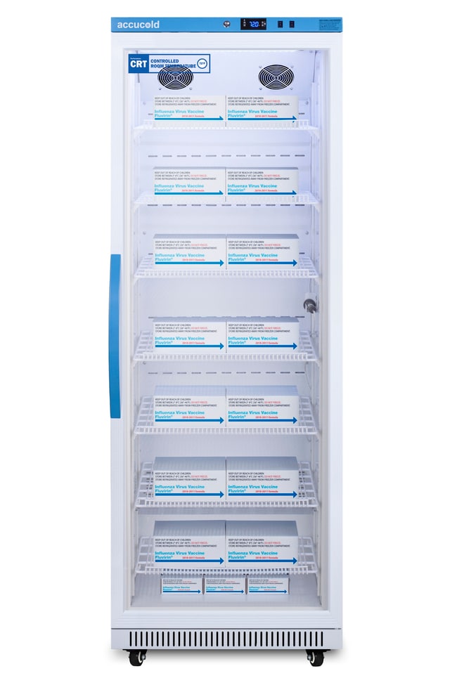ACCUCOLD ARG18PV-CRT (18cf) Controlled Room Temperature (CRT 68°F TO 77°F) cabinets are designed and purpose-built for ambient medication and vaccine storage in pharmacy and patient care areas. PRE-SET TO 72°F. Equipped with Hi/Lo Temp Alarm, Remote Contacts, open door alarm, power failure alarm, Sensor failure alarm, Self closing door, Hospital grade cord & plug, Access Port, Antimicrobial Handle. +/-1.5ºC Variation The published temperature variation is derived from the maximum deviation of an NTC sensor in a 1 oz. vial located nearest the chamber geometric center during a 24 hour test period. LED interior Light. Glass Door
