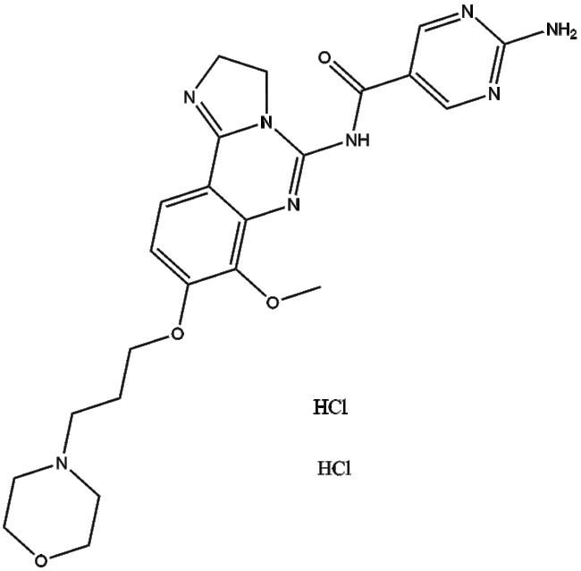 Copanlisib dihydrochloride (CAS 1402152-13-9) is a small-molecule inhibitor that selectively targets phosphoinositide 3-kinase (PI3K) isoforms and By inhibiting these PI3K subunits copanlisib disrupts PI3K/AKT signaling pathways that regulate cellular proliferation and survival leading to reduced tumor cell growth and induction of apoptosis This compound is utilized in biomedical research to investigate PI3K-mediated oncogenic processes particularly in studies related to relapsed or refractory follicular lymphoma and other hematologic malignancies dependent on aberrant PI3K activity