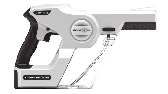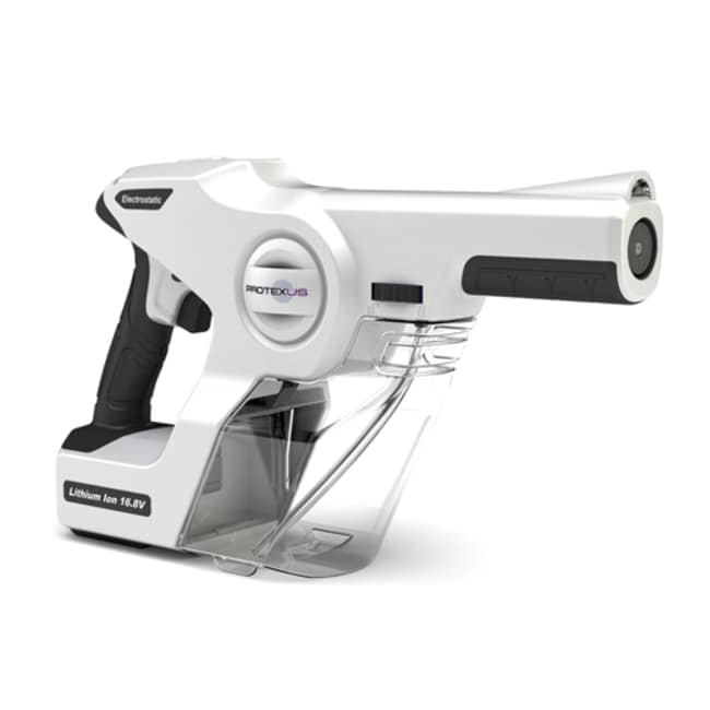 Professional Cordless Electrostatic Handheld Sprayer. Bag, charger, nozzle wrench, and spare parts included. Holds 32 oz of liquid, covers 1,000 sqft of surface area.