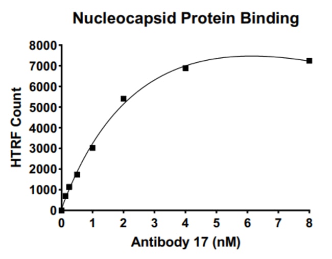 SARS-CoV-2 Nucleocapsid protein (NP) is one of the core components of SARS-CoV-2 virus. It forms a complex with viral genomic RNA in a helical symmetrical structure and plays a key role in the process of virus replication and assembly. Since NP is abundantly expressed during infection, it can be used as an important diagnostic marker for COVID-19 and also can be used as a potential drug target or developing vaccines. Terbium-labeled anti-Tag1 antibody serves as fluorescence donor, that binds to the His-Tagged NP. If a test rabbit antibody binds to NP, fluorescence- labeled anti-rabbit antibody (fluorescence acceptor) will be brought in close proximity with the fluorescence donor. Excitation of Terbium (340 nm) generates fluorescence resonance energy transfer (FRET) to the fluorescence-labeled acceptor, which consequently fluoresces at 665 nm (figure below). Thus, the test antibody binding to NP can be quantitively measured by calculation of the fluorescent ratio of 665 nm/620 nm.