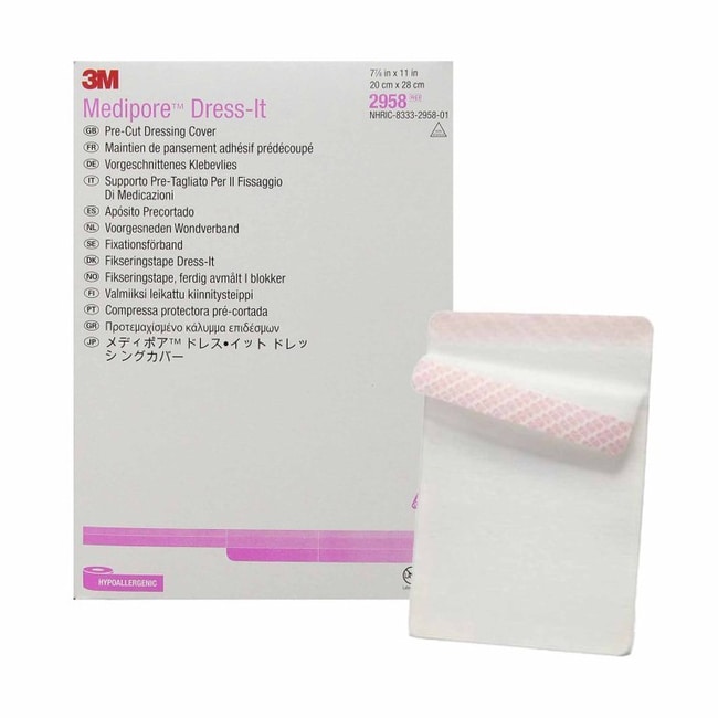 The 3M Medipore Dress-It pre-cut dressing cover secures dressings where skin may stretch It comes pre-cut to save time and effort The material is gentle and breathable to enhance comfort and maintain the skin It's stretchy to help conform easily around body contours The 7-7/8-inch x 11-inch cloth tape provides no self-adhesion or curling, making it easy to handle The white tape is latex-free to prevent allergic reactions There are 25 non-sterile pads in a box