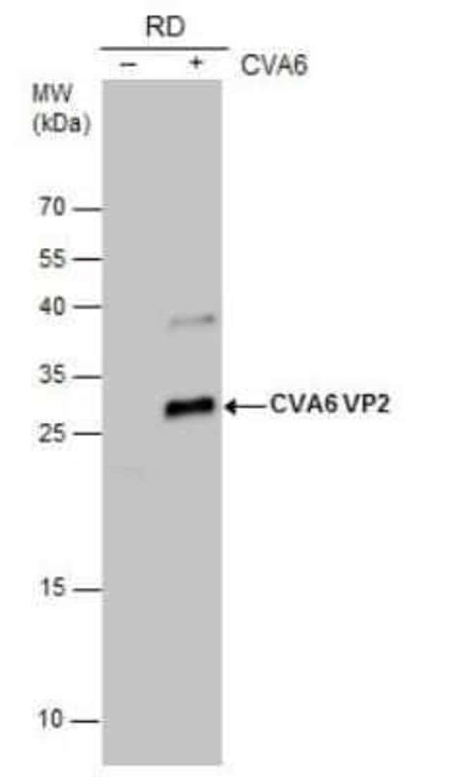 Coxsackievirus A6 VP2 Polyclonal antibody specifically detects Coxsackievirus A6 VP2 in Virus samples. It is validated for Western BlotSpecifications