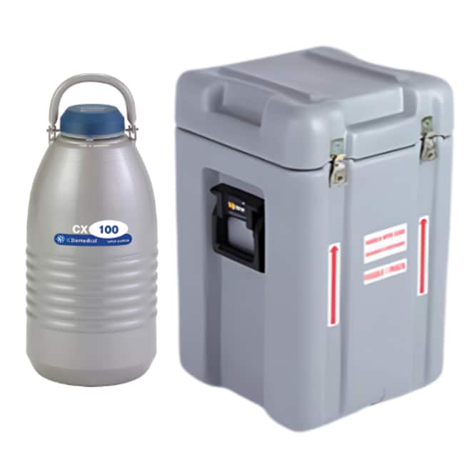 This bundle features the CX100 Cryo Express Dry Shipper by IC Biomedical paired with a robust square shipping case, providing a complete solution for secure cryogenic material transport. The CX100 Dry Shipper is engineered to safely move various materials at approximately -190°C. Its unique adsorbent material prevents liquid nitrogen spills even if tipped, ensuring reliable transit and IATA compliance for non-infectious biological samples. The included square shipping case, measuring 17" x 17" x 25" and weighing 32 lbs, offers superior physical protection. Made of thick, hard plastic with a padded lining, it features a secure latching mechanism and side handles for easy, safe transport. The CX100 offers an 18-day static holding time and 4.1 liters LN2 adsorbed capacity.