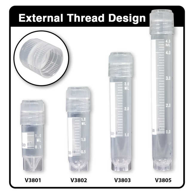 MTC Bio Cryogenic Vials, externally threaded caps with silicone O-ring, 3mL, sterile, printed graduations and marking area, self-standing star foot, 50-place locking rack included with each case, 10 resealable bags of 50 tubes, 500/cs