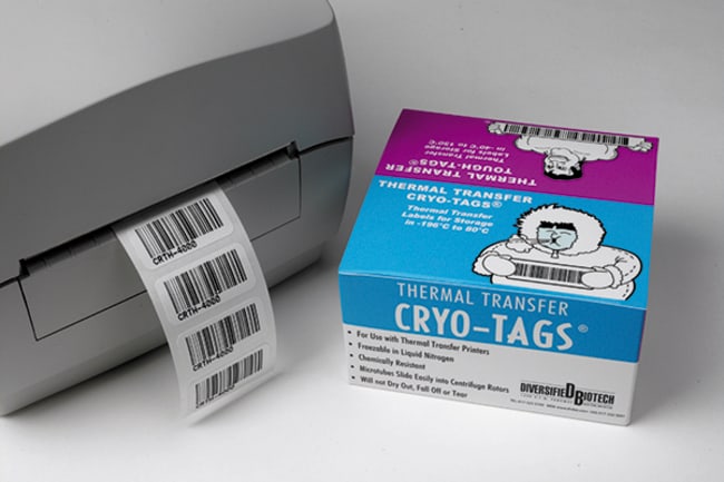 Thermal Transfer Cryo-Tags are pre-cut, peel-off labels that are designed for use in thermal transfer printers. The labels are a reliable and convenient way to identify samples with text or a barcode on microtubes, microplates, bottles and other laboratory containers. The labels are resistent to degradation from scuffing, chemicals, moisture and wide temperature fluctuation. The unique solvent-resistant, acrylic-based adhesive provides excellent cold temperature performance. Specially coated for use with a resin ribbon that provides the best performance under extreme conditions.