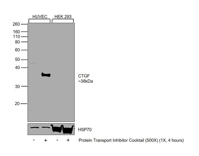 Recommended positive controls: A549, H1299, HCT116, HUVEC, Mouse heart, Rat bladder, CTGF-transfected 293T, HepG2, HepG2 conditioned medium. Predicted reactivity: Mouse (93%), Rat (94%), Xenopus laevis (85%), Pig (95%), Chicken (94%), Sheep (96%), Chimpanzee (99%), Bovine (93%). Store product as a concentrated solution. Centrifuge briefly prior to opening the vial.