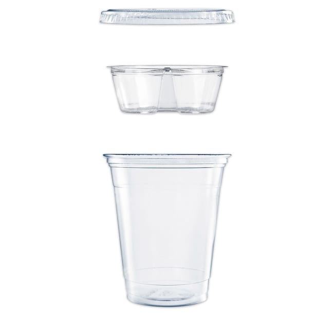 Merchandising delicious and healthy snacks to go has never been easier Cup inserts by Dart turn clear cups into portable grab-and-go food packages Use to create savory snack combinations or sweet treats The Clean Lift Post allows customers to easily pinch and lift off the cup insert keeping both hands and food clean The crystal clear inserts offer exceptional clarity to showcase yogurt and toppings carrots and hummus pretzels and cheese cubes and so much more The options are endless These are perfect for grab and go counters grocery stores and delis Sets include clear cups cup inserts and lids Made of recyclable PET check locally may not be recycled in your area Single Compartment Insert Cup Type- Portion Cup Interior Volume Capacity- 12 oz Material(s)- Polyethylene Terephthalate (PET) Material Type- Plastic