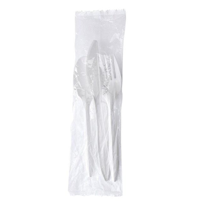 Serve virtually any meal with this cutlery kit Each pre-packaged cutlery wrapped kit contains a medium weight plastic fork spoon and knife The convenient kits make set-up for an event or packing a to-go meal quick and easy Individually packaged for convenience and to ensure utensils remain sanitary even after handling Perfect for outdoor gatherings large parties and take-out meals Utensils Type- Fork Knife Spoon Material Type- Plastic Material(s)- Polystyrene Color(s)- White