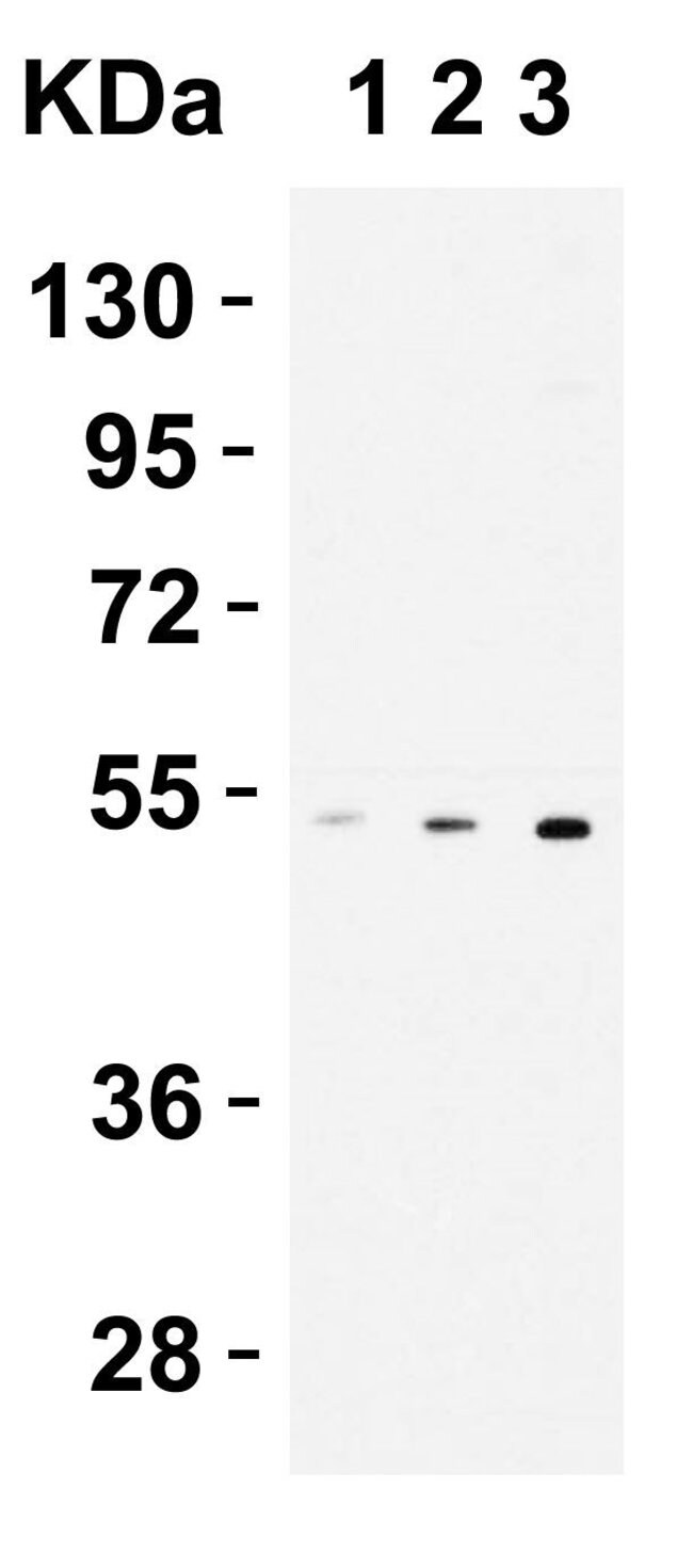 In Western blot applications, this antibody detects a band at ~50kDa. A suggested positive control is human spleen tissue lysate. PA5-19910 can be used with blocking peptide PEP-0036.