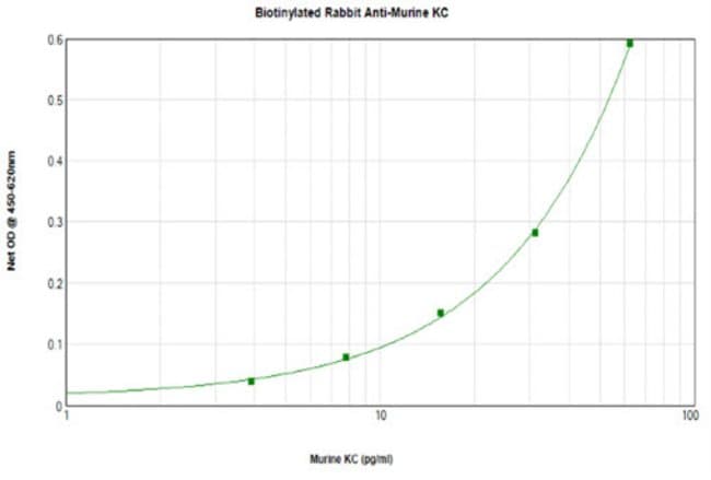 AA Sequence of recombinant protein: APIANELRCQ CLQTMAGIHL KNIQSLKVLP SGPHCTQTEV IATLKNGREA CLDPEAPLVQ KIVQKMLKGV PK. Preparation: Produced from sera of rabbits immunized with highly pure Recombinant Murine KC (CXCL1). Anti-Murine KC (CXCL1)-specific antibody was purified by affinity chromatography and then biotinylated. Sandwich ELISA: To detect Murine KC (CXCL1) by sandwich ELISA (using 100 μL/well antibody solution) a concentration of 0.25-1.0 μg/mL of this antibody is required. This biotinylated polyclonal antibody, in conjunction with PeproTech Polyclonal Anti-Murine KC (CXCL1) (500-P115) as a capture antibody, allows the detection of at least 0.2-0.4 ng/well of Recombinant Murine KC (CXCL1). Western Blot: To detect mKC by Western Blot analysis this antibody can be used at a concentration of 0.1-0.2 μg/mL. Used in conjunction with compatible secondary reagents the detection limit for Recombinant mKC is 1.5-3.0 ng/lane, under either reducing or non-reducing conditions. 500-P115BT-1MG will be provided as 2 x 500 μg