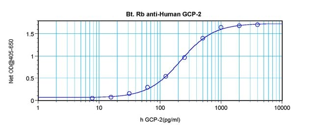 AA Sequence of recombinant protein: VLTELRCTCL RVTLRVNPKT IGKLQVFPAG PQCSKVEVVA SLKNGKQVCL DPEAPFLKKV IQKILDSGNK KN. Preparation: Produced from sera of rabbits immunized with highly pure Recombinant Human GCP-2 (CXCL6). Anti-Human GCP-2 (CXCL6)-specific antibody was purified by affinity chromatography and then biotinylated. Sandwich ELISA: To detect Human GCP-2 (CXCL6) by sandwich ELISA (using 100 μL/well antibody solution) a concentration of 0.25-1.0 μg/mL of this antibody is required. This biotinylated polyclonal antibody, in conjunction with PeproTech Polyclonal Anti-Human GCP-2 (CXCL6) (500-P120) as a capture antibody, allows the detection of at least 0.2-0.4 ng/well of Recombinant Human GCP-2 (CXCL6). Western Blot: To detect hGCP-2 by Western Blot analysis this antibody can be used at a concentration of 0.1-0.2 μg/mL. Used in conjunction with compatible secondary reagents the detection limit for Recombinant hGCP-2 is 1.5-3.0 ng/lane, under either reducing or non-reducing conditions. 500-P120BT-1MG will be provided as 2 x 500 μg
