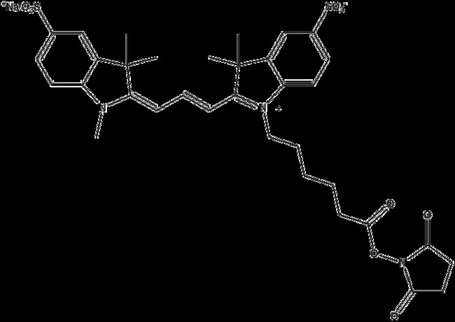 Apexbio Technology LLC Cy3 NHS ester, 5mg. Cas: MFCD: MFCD28505569. Labeling of amino-groups in biomolecules.