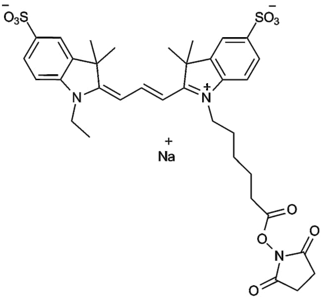 Cy3 NHS ester(Et) is a small molecule commonly employed in biomedical research as a reactive fluorescent reagent Through its N-hydroxysuccinimide (NHS) ester functionality it readily forms stable covalent linkages with primary amine groups present on proteins peptides and other biomolecules Due to its fluorescent character Cy3 NHS ester(Et) is extensively utilized for labeling biological targets enabling visualization and tracking in fluorescence microscopy and imaging analyses This property facilitates investigations into molecular localization trafficking processes and pathology-associated pathways in various experimental models