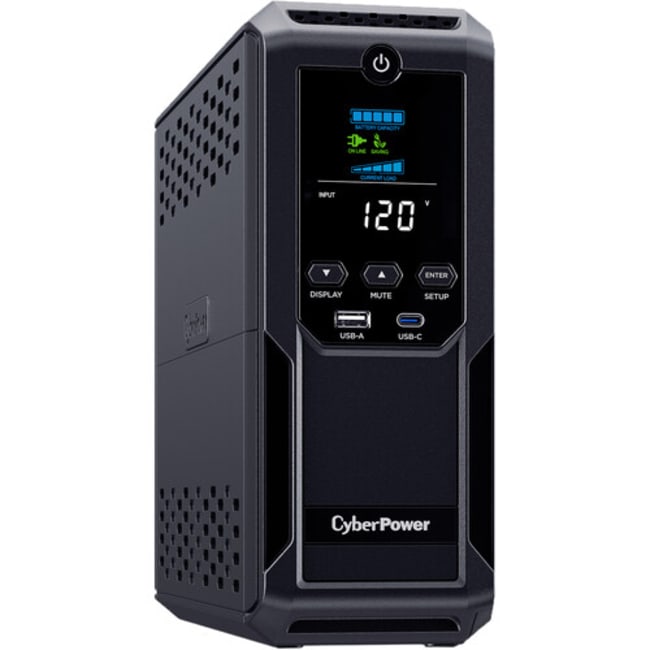 The BRG1500AVRLCD2 Intelligent LCD Series UPS from CyberPower is a mini-tower device with line-interactive topology that provides battery backup and surge protection via sine and simulated sine waveform output for desktop computers, workstations, networking devices, and home entertainment systems. It provides an output capacity of 1500 VA / 900W and features an input voltage of 120 VAC at 57-63 Hz using Automatic Voltage Regulation (AVR) to help correct minor power fluctuations without switching to battery power.