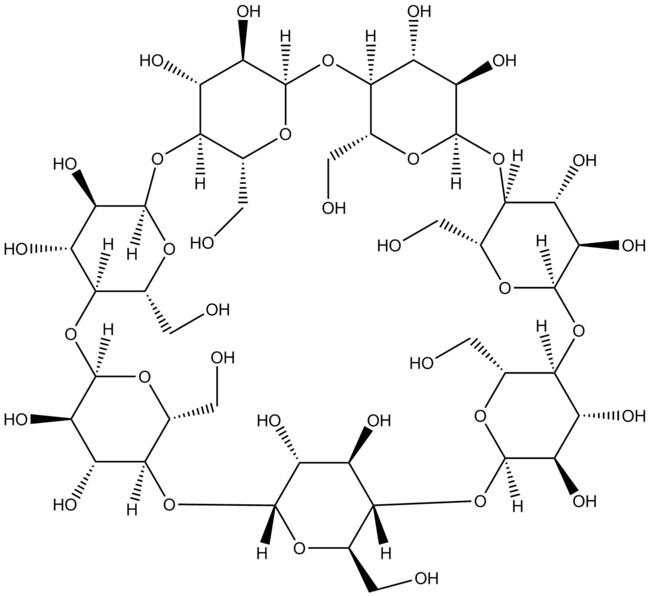 beta-Cyclodextrin (CAS 7585-39-9) is a cyclic oligosaccharide composed of -D-glucopyranoside units linked by -(1 4) glycosidic bonds beta-Cyclodextrin enhances the aqueous solubility of hydrophobic active molecules through molecular encapsulation beta-Cyclodextrin exerts its biological activity primarily by encapsulating hydrophobic compounds improving their bioavailability In cell-based viral replication assays beta-Cyclodextrin demonstrates antiviral activity with IC50 values ranging from 3 5 to 7 5 mM against H1N1 influenza virus strains depending on experimental conditions Based on these pharmacological properties beta-Cyclodextrin holds research potential in pharmaceutical formulation and antiviral screening