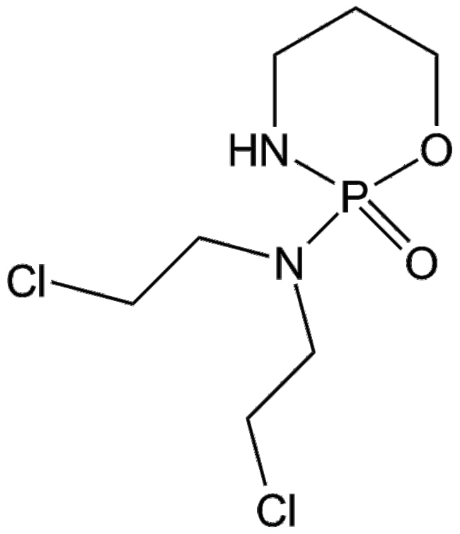 Cyclophosphamide is a nitrogen mustard alkylating prodrug activated via hepatic enzymes to its active metabolites These metabolites alkylate DNA primarily at guanine residues resulting in DNA cross-linking strand breaks and mutations consequently triggering cytotoxic effects Cyclophosphamide exhibits cytotoxicity in vitro with an IC50 of 37 6 M in mouse embryo BALB/c 3T3 cells and an IC50 of 8 79 M against human HL60 cells It impacts immune regulation by decreasing regulatory T cell counts and suppressive marker expression (FoxP3 GITR) facilitating immune response modulation Commonly applied in cancer and immunological research cyclophosphamide is also employed in genotoxicity assays due to its capacity to induce chromosomal aberrations and mutations