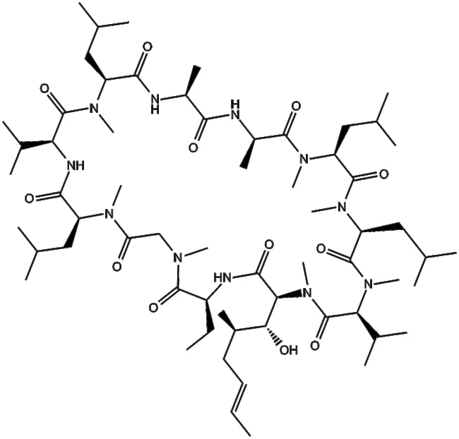 Cyclosporin A is an immunosuppressive agent acting primarily through inhibition of cyclophilins intracellular peptidyl-prolyl isomerases with a reported IC50 of 7 nM Cyclophilins regulate mitochondrial permeability transition pore (MPTP) opening intracellular calcium signaling and NFAT transcriptional activation pathways Cyclosporin A s ability to inhibit calcineurin-NFAT signaling in T-cell activation leads to suppression of inflammatory immune responses indicating potential use in autoimmune disorder research Additionally it modulates cell apoptosis and survival mechanisms in diverse models including retinal ischemic injury viral entry (HBV HCV) and tumor biology in colon cancer cell lines