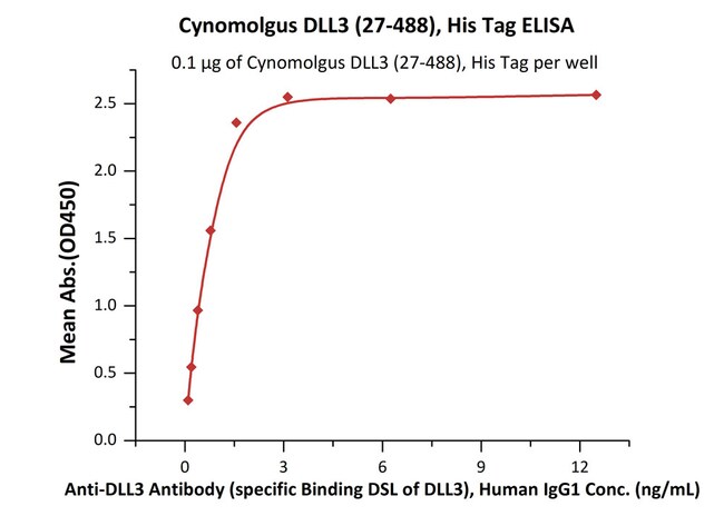 ACROBiosystems Cynomolgus DLL3 (27-488), His Tag (DL3-C52H9) is expressed from human 293 cells (HEK293). It contains AA Ala 27 - Arg 488 (Accession # A0A2K5WSR1-1).