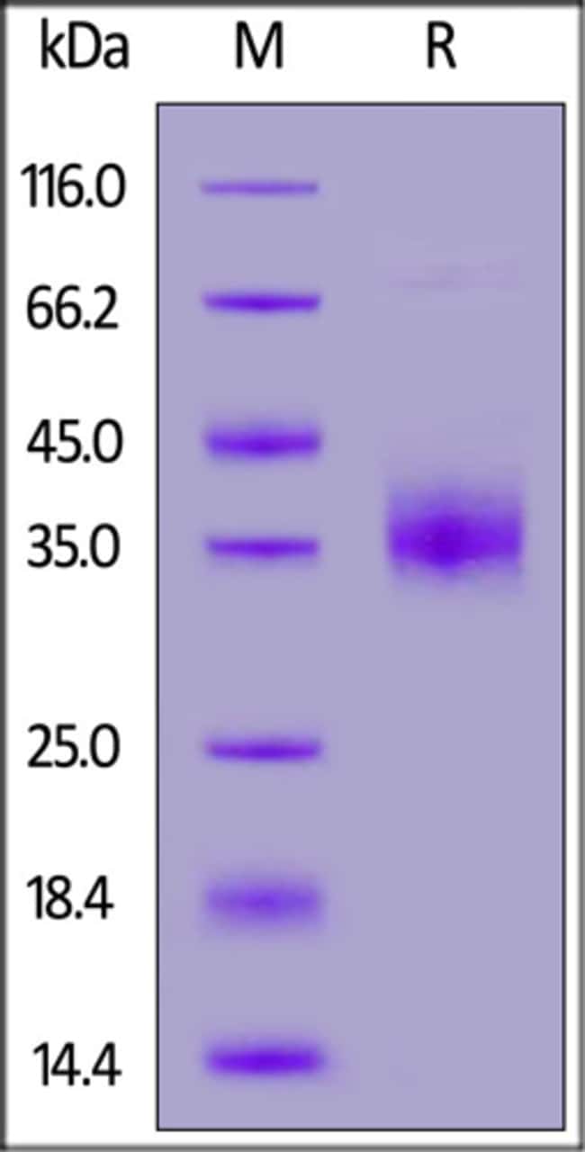 Recombinant Protein;100UG;Cynomolgus NKp46, His Tag (NC1-C52H4) is expressed from human 293 cells (HEK293). It contains AA Pro 22 - Arg 257 (Accession # Q95JB9-1).;This protein carries a polyhistidine tag at the C-terminus. The protein has a calculated MW of 28.6 kDa. The protein migrates as 34-40 KDa under reducing (R) condition (SDS-PAGE) due to glycosylation.