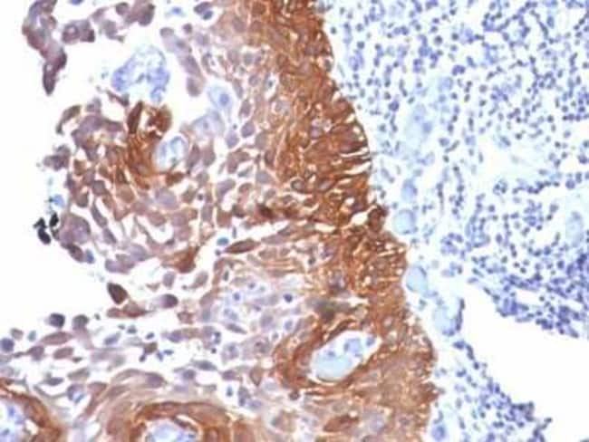 | This MAb reacts with a wide variety of simple epithelia. It does not react with stratified squamous epithelia. It reacts with epithelial tumors of the gastrointestinal tract, lung, breast, pancreas, ovary, and thyroid. Cytokeratin 18, which belongs to the type A (acidic) subfamily of low molecular weight keratins, exists in combination with cytokeratin 8. It is reported that tissues from gastrointestinal tract are positive for both cytokeratin 8 and 18 but do not contain cytokeratin 14. Tissues from gastrointestinal tract, respiratory tract and urogenital tract, as well as endocrine and exocrine tissues and mesothelial cells are positive for cytokeratin 18. |