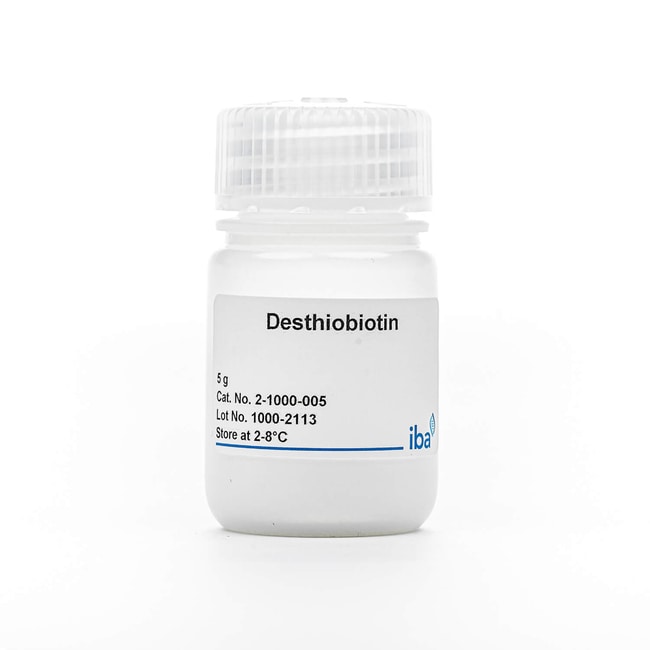 Desthiobiotin is a modified form of biotin that displaces Strep-tagII and Twin-Strep-tag fusion proteins from the modified biotin-binding pocket of Strep-Tactin in a competitive manner, resulting in a mild elution. Desthiobiotin powder can be used for preparation of Strep-Tactin elution buffer, Buffer E. Please note that desthiobiotin is not applicable for elution from Strep-TactinXT resins.