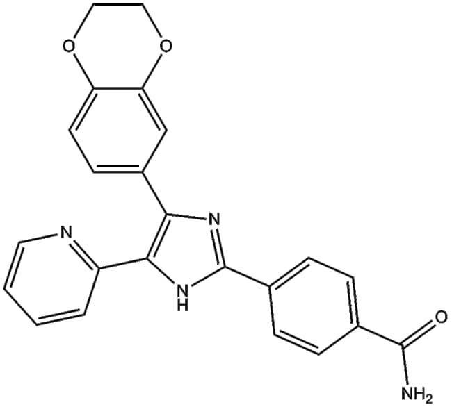 D4476 (CAS 301836-43-1) is a selective cell-permeable inhibitor of casein kinase 1 (CK1) and ALK5 exhibiting IC50 values of 0 3 M for CK1 and 0 5 M for ALK5 (at 0 1 mM ATP in vitro) It likely acts via ATP-competitive inhibition of CK1 showing minimal to no significant inhibitory activity against SAPK2a/p38 PKB or SGK Treatment with D4476 inhibits CK1-mediated phosphorylation of FOXO1a (Ser322 and Ser325) and RhoB (Ser185) in H4IIE and HeLa cells respectively impacting downstream processes such as nuclear export dynamics and actin cytoskeleton regulation Additionally it induces partial p53-dependent growth arrest in HCT116 cells