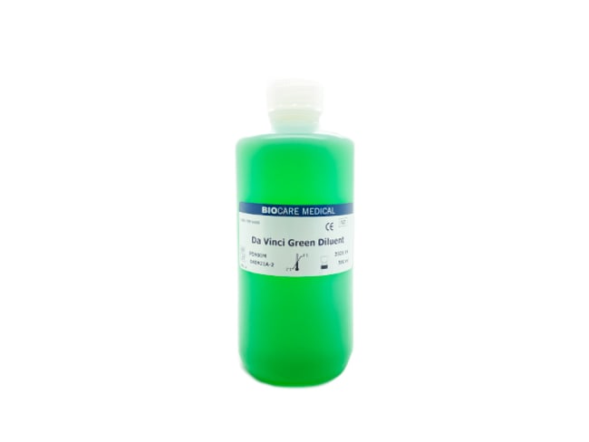 Da Vinci Green antibody diluent is a modified PBS formulation with protein carrier and preservative. This modified PBS is formulated for superior performance and stability. In addition, it is protease and IgG-free. Da Vinci Green is Biocare's new standard-universal PBS diluent. It can also be used on an automated staining system.