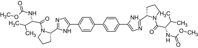MW 738.9 Da, Purity =97%. Daclatasvir a potent, direct acting, small molecule inhbitor of HCV NS5A protein. It inhbibits replicons expressing a wide range of HCV genotypes with EC₅₀ values in the pM range (9 and 71 pM against the 1b and 2a genotypes, respectively). It also inhibits infection by the JFH-1 genotype 2a virus in cultured cells. Daclatasvir is thought to inhibit relication of the HCV viral genome by affecting the subcellular localization of HCV NS5A and preventing its incorporation into relication complexes. In HCV-infected Huh7 cells, Daclatasvir (1 nM) inhibits viral RNA synthesis and viron assembly. Daclatasvir displays moderate activity against the OAT1B1 (IC₅₀ = 1.5 μM) and OAT1B3 (IC₅₀ = 3.27 μM) organic anion transporters.