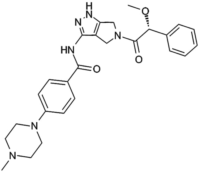Danusertib (PHA-739358 CAS 827318-97-8) is a pyrrolopyrazole-based aminopyrazole derivative that functions as a pan-inhibitor of aurora kinases prominently targeting aurora B kinase (ABK) It also exhibits inhibitory activity against several other tyrosine kinases including the T315I mutant form RET TRK-A and fibroblast growth factor receptor-1 (FGFR-1) Due to its broad kinase inhibition profile danusertib has demonstrated significant antitumor activity in various xenograft spontaneous and genetically engineered animal models and is thus useful in oncology research involving leukemia and solid tumors