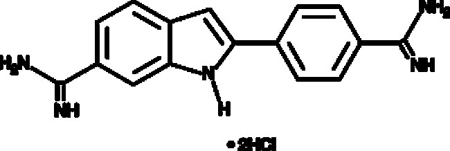 A fluorescent probe which is commonly used to stain DNA and chromosomes for fluorescent microscopy and flow cytometry applications; characterized by ultraviolet (max 358 nm) excitation and blue (max 461 nm) emission wavelengths