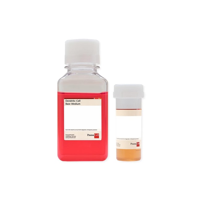 The PromoCell Dendritic Cell (DC) Generation Medium has been developed for the easy and efficient generation of immature as well as fully mature myeloid Dendritic Cells from peripheral blood monocytes. The DC Base Medium is a user-customizable versions of the DC Generation Media that does not include cytokines.PromoCell DC Generation Medium allows for the generation of DC from cryopreserved as well as freshly isolated cells. In the latter case, the Monocyte Attachment Medium is also needed.PromoCell DC Media consist of a bottle of Basal Medium and one vial of SupplementMix. Adding the SupplementMix to the Basal Medium results in the complete Medium. Indeed, all DC Media must be supplemented with additional cytokines. The cytokines are included with the DC Generation Media but not with the DC Base Media.