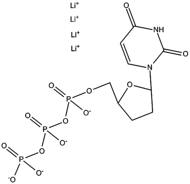 ddUTP is a synthetic nucleotide analog designed to terminate DNA chain elongation by DNA polymerases ddUTP exerts its biological activity primarily through incorporation into nascent DNA strands where the absence of a 3 -hydroxyl group prevents further phosphodiester bond formation and subsequent nucleotide addition Based on these pharmacological properties ddUTP holds research potential in DNA sequencing methodologies including Sanger sequencing and in termination-based DNA labeling experiments for mapping genomic sequences and structural features