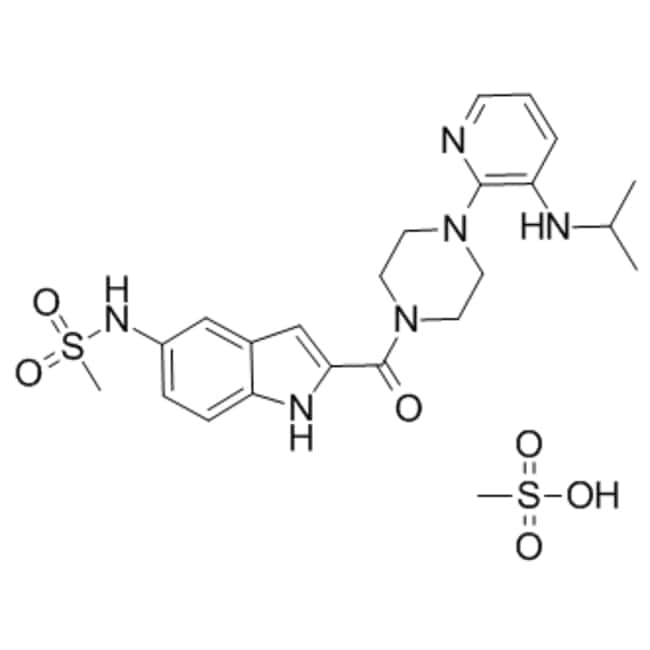Delavirdine mesylate (CAS 147221-93-0) is a small-molecule inhibitor targeting HIV-1 reverse transcriptase It is designed to selectively inhibit the enzymatic activity of HIV-1 reverse transcriptase thereby disrupting viral DNA synthesis and impeding HIV replication Delavirdine mesylate exerts its biological activity primarily through direct binding to an allosteric site on HIV-1 reverse transcriptase In biochemical studies delavirdine mesylate demonstrates inhibitory activity against HIV-1 reverse transcriptase with an IC50 value of 0 26 M Based on these pharmacological properties delavirdine mesylate holds research potential in antiviral assays HIV resistance studies and mechanistic investigations into NNRTI-related enzyme inhibition