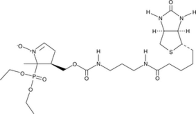 A biotinylated form of DEPMPO, which is used to spin trap reactive O-, N-, S-, and C-centered radicals; offers monitored biodistribution in cells, tissues and organs when used with an avidin-conjugated reporter; binds free radicals on proteins, producing adducts that can be analyzed via the biotin tag.