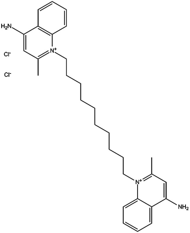 Dequalinium Chloride (CAS 522-51-0) is a small molecule inhibitor known to target protein kinase C (PKC) with reported IC50 values between 7 18 M PKC is a serine/threonine kinase involved in calcium- and lipid-dependent signaling pathways critical for cell growth and transformation Dequalinium Chloride also acts as a selective blocker of apamin-sensitive potassium channels exhibiting an IC50 of 1 1 M and inhibits angiotensin II-induced K loss (IC50 1 5 M) Notably dequalinium accumulates in mitochondria of cancer cells disrupts mitochondrial enzymes and impairs cellular energy production ultimately leading to cell death It has been used in studies of apoptosis mitochondrial function and as an adjunct in tumor models investigating sensitization to agents such as TNF