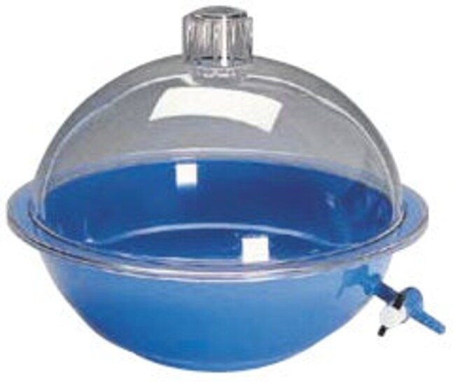Round polycarbonate cover and polypropylene base create implosion-proof chamber at full vacuum Chamber is impervious to alkali and acidic conditions Recessed rim prevents grease (not included) from contacting bench surfaces when removed and eliminates need for a separate gasket This vacuum model features leak-proof stopcock Dimensions (height x diam) 245 mm x 330 mm (9 7in x 13in ) Holds 454 g (1 lb) of dessicant Ceramic dessicator plate (sold separately) is inert non-stick and corrosion resistant Quadrants crafted into plate for easy tracking of material locations Plate diameter 230 mm (9in )