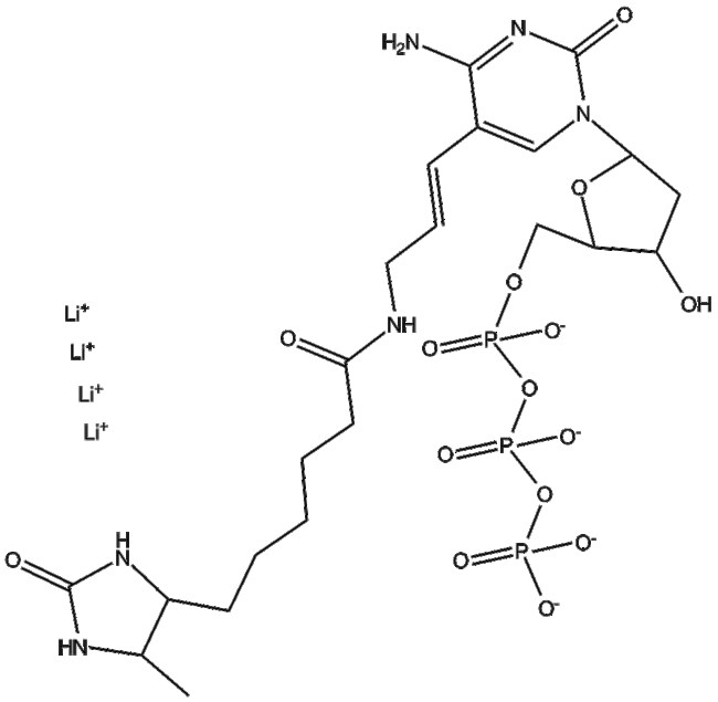 Desthiobiotin-6-dCTP is a modified deoxycytidine triphosphate derivative featuring a desthiobiotin moiety attached via a hexyl linker to the cytosine base It is designed to be efficiently incorporated into nucleic acids by DNA polymerases during enzymatic synthesis thereby enabling subsequent detection or isolation through streptavidin or anti-biotin antibody binding Based on these properties Desthiobiotin-6-dCTP holds research potential in nucleic acid probe labeling in situ hybridization assays genetic testing nucleic acid purification and other molecular biology research applications