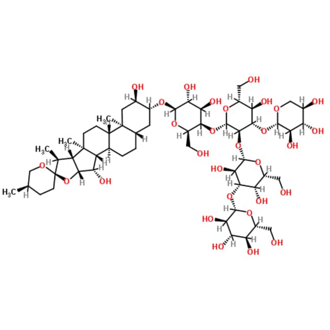 Digitonin is a nonionic saponin steroid derived from the plant Digitalis purpurea. It is useful for creating Digitonin-cholesterol complexes which form when Digitonin disrupts the cell membrane and binds with cholesterol in a nearly 1:1 stoichiometric ratio. When precipitated from ethanolic solutions, these complexes form flat lamellar sheets. Digitonin’s cholesterol displacing properties have been used in newer applications to quantify the rate of lysosomal membrane permeabilization (LMP), a new technique developed to bypass traditional cell death pathways. Digitonin permeabilizes plasma membranes but leaves lysosomal membranes intact, allowing for a quantifiable measurement of lysosomal hydrolases and comparison to normal cellular enzyme activity. Digitonin has been shown to induce hemolysis in red blood cells