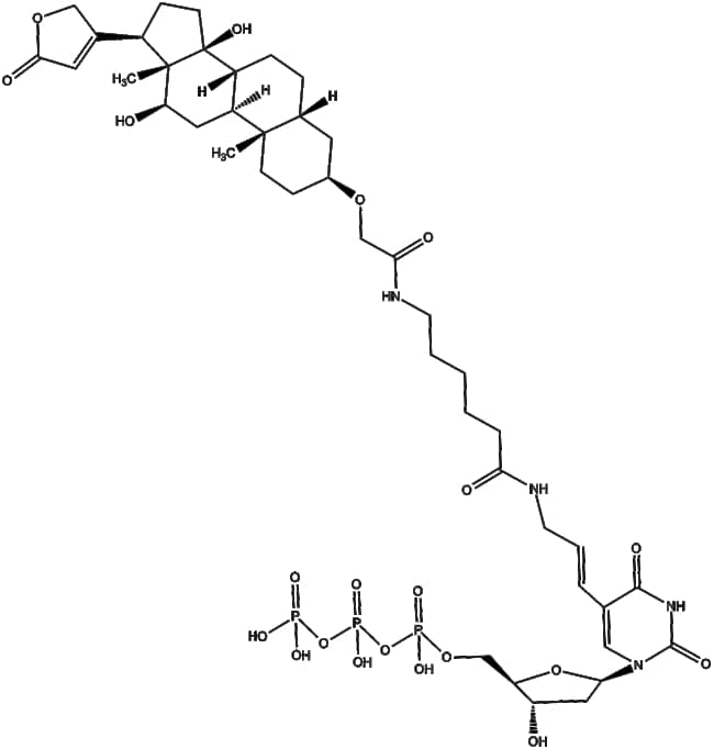 Digoxigenin-11-dUTP is a modified nucleotide analog designed for incorporation into DNA or cDNA by enzymatic processes substituting for natural dTTP The digoxigenin moiety attached via an 11-atom linker to the C5-position of the uridine base facilitates recognition by anti-digoxigenin antibodies labeled with horseradish peroxidase alkaline phosphatase or fluorophores Digoxigenin-11-dUTP is enzymatically incorporated using methods such as PCR amplification nick translation primer extension 3 -end labeling and reverse transcription Based on these properties Digoxigenin-11-dUTP is primarily utilized in probe-based assays sequencing and fluorescent or chromogenic in situ hybridization (ISH) applications
