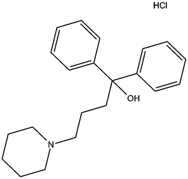 Diphenidol hydrochloride (CAS 3254-89-5) is a small molecule that acts as a nonselective antagonist of muscarinic acetylcholine receptors targeting subtypes M1 through M4 It also inhibits multiple voltage-gated ion channels including sodium (Na ) potassium (K ) and calcium (Ca ) channels thereby modulating neuronal excitability Diphenidol hydrochloride has demonstrated antiarrhythmic activity and is frequently employed in studies investigating the neurophysiological mechanisms underlying vertigo and the pathways involved in antiemetic responses Its polypharmacological profile makes it a suitable tool for research into neural signaling and emesis modulation