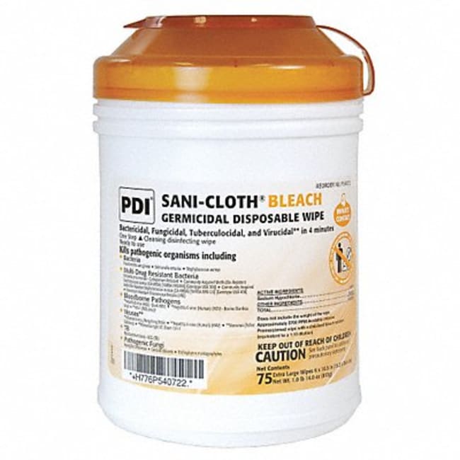 The PDI Sani-Cloth Germicidal Disposable Wipe is a ready-to-use, pre-moistened wipe that kills 99.9% of germs in as little as 3 minutes. It contains 0.5% quaternary ammonium chlorides and is effective against a broad spectrum of bacteria, viruses, fungi and spores. The wipes come in a tub of 160 6" x 6.75" wipes that can be used for disinfecting hard, nonporous surfaces such as stainless steel, glazed porcelain, plastic surfaces like telephones, bed railings, doorknobs, and more. The wipes are latex-free.