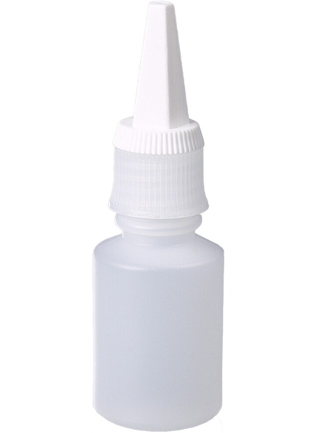 The dropper bottle can be re-closed with a separate screw cap. The long and very pointed dropper tip is sealed and cut off before first use. The dropper tip can be shortened to adjust the drop size.