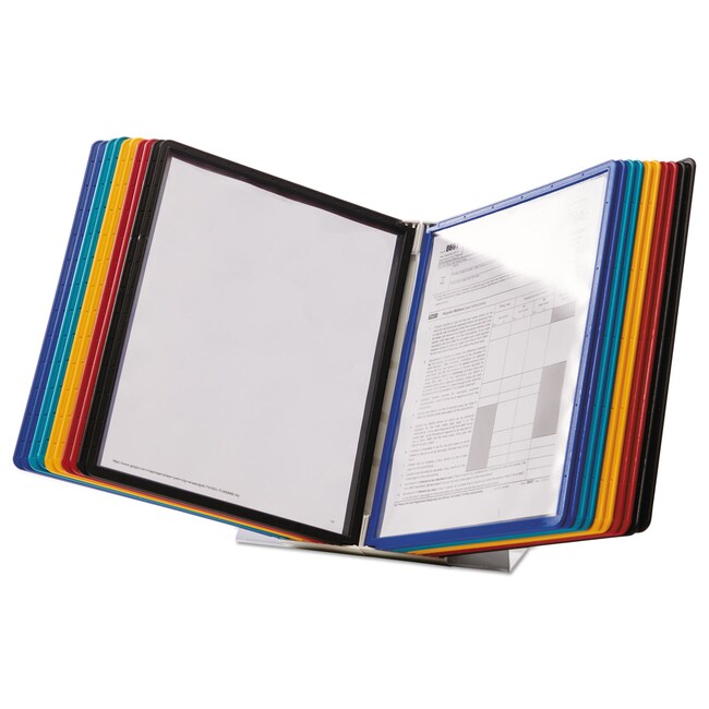 Organize and quickly access frequently used documents with the VARIO 10-Panel Desktop Reference System from DURABLE This German-designed organizational powerhouse is meticulously crafted for anyone seeking unparalleled efficiency Made with German precision this reference display system is a testament to quality ensuring lasting durability Say goodbye to flimsy alternatives and embrace the reliability of VARIO Experience efficiency at your fingertips with easy-load glare-free and scratch-resistant pockets Each high-quality sleeve is engineered to keep your paperwork crease and tear-free even with frequent handling The powder-coated steel base and non-slip grip also provide a stable foundation that stands up to heavy use With 10 pockets capable of displaying up to 20 letter-size sheets VARIO is the go-to solution for organizing schedules SOPs directories class lists instructions charts maps emergency numbers menus team rosters any frequently referenced paperwork