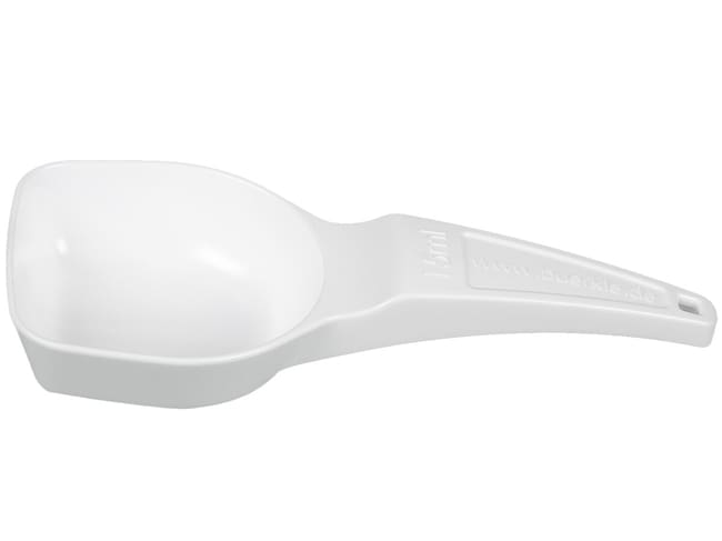 The flat front edge of the volumetric spoon is ideal for picking up medium from the bottom of the container or for getting into the corners of the container, thus allowing for good emptying of small remaining amounts. The flat base makes it possible to set the volumetric spoon down without spilling the content.