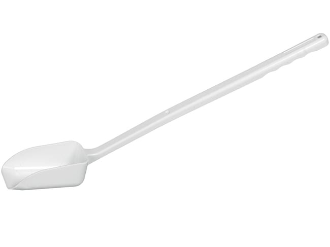 The disposable sample scoop with extra-long handle is designed for single use, ideal for sampling from large containers, even with limited contents or narrow openings.