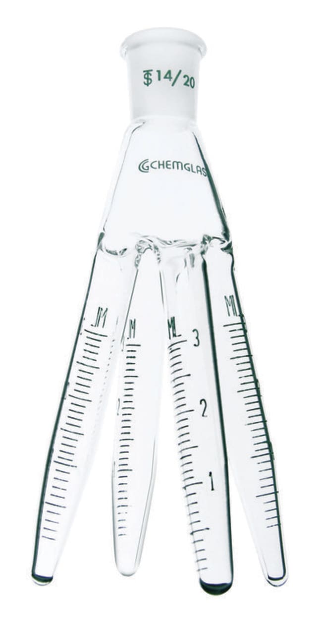 Distilling Receiver, 3mL, 14/20 Joint, Graduated, 210mm height x 90mm width. Cow type receiver has a single standard taper outer joint at the top. The four lower graduated receiver tubes can be accessed via a syringe for product recovery. Tubes are graduated from 0 to 3mL in 0.2mL subdivisions.